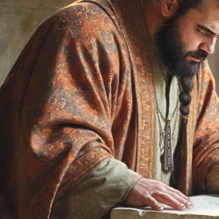 Eine andere Art von Textilmustern findet sich in diesem Beispiel. Jedes Volk spricht natürlich eine eigene Sprache und benutzt damit auch seine eigenen Schriftzeichen. Auf Min Vallesks Kopfbedeckung sind zwei Schriftzeichen der Selessem in dem Muster erkennbar.