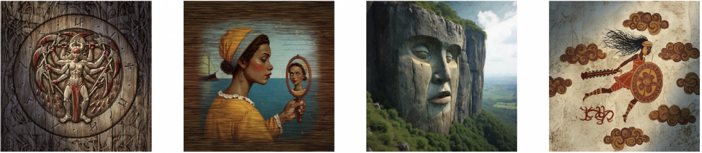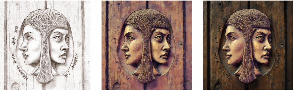 „The medium is the message“ bedeutet hier, dass die verschiedenen Völker ihre Godheiten auch künstlerisch unterschiedlich darstellen. Die Utreng z. B. schnitzen ihre heiligen Bilder gerne in Holz, weil Holz im Hochgebirge des Salthras schwer zu beschaffen und deshalb ein wertvolles Material ist. Die Selessem malen ihre naiven Darstellungen zwar auch auf Holz, aber nur deshalb, weil sie sich als armes Fischervolk keinen anderen Malgrund leisten können. In der enormen Felsklippe am Rand der Lhaedineer Tiefebene haben die Lhaedineeri den idealen Ort für monumentale Abbildungen ihrer Godheiten gefunden. Die Tarraner wiederum haben die Kunst der Bildhauerei perfektioniert, denn die Bearbeitung von Stein hat dort eine Tradition, die bis zu den ersten Menschen vom Weißen Meer zurückreicht.