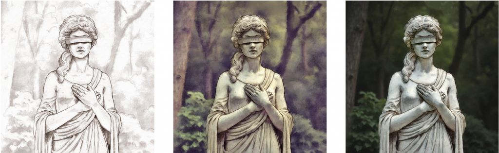 Um diese Stilvielfalt überzeugend darstellen zu können, sind Gegenstände und Materialien möglichst realistisch dargestellt, denn nur durch den Kontrast dazu wird deutlich, dass das, was aussieht wie eine Zeichnung auf Pergament auch als „Zeichnung auf Pergament“ gemeint ist.